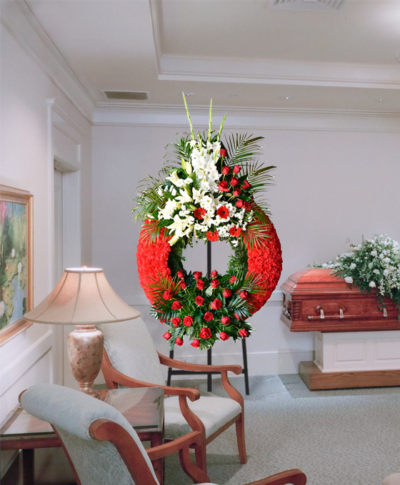 Somos especialistas en el arte floral funerario de ahí que, esta corona de funeral roja para Tanatorio, contenga flores rojas para expresar condolencias y así facilitar la despedida de un ser querido de una forma más íntima. Siempre elaboramos las coronas funerarias para difuntos con flores fúnebres de primera calidad; nuestras flores son siempre frescas y están suministradas por proveedores nacionales e internacionales. Es por ello que nuestra Corona funeraria para defunción es de primera calidad e incluye flores blancas para expresar condolencias que acompañan el sentimiento de la familia del difunto.
